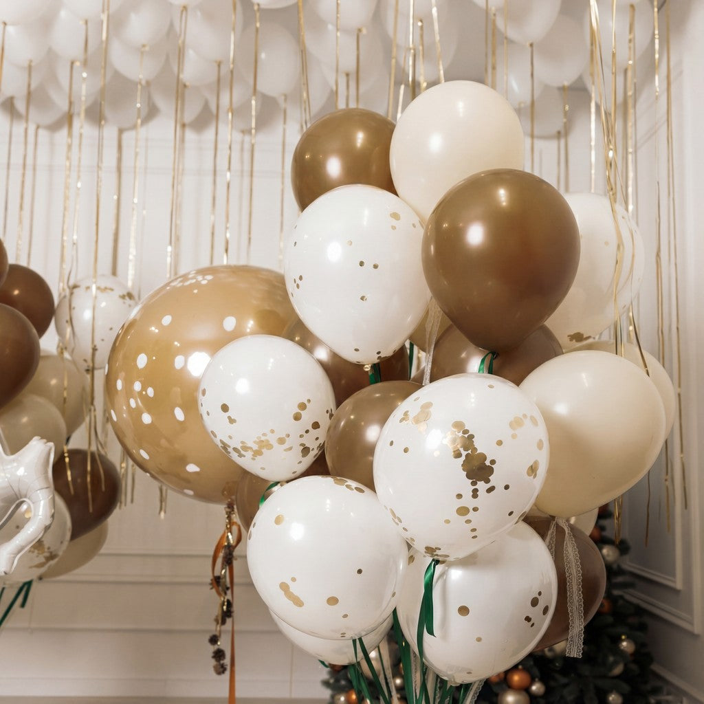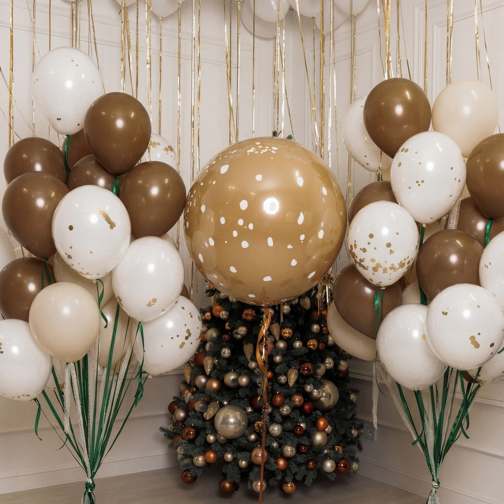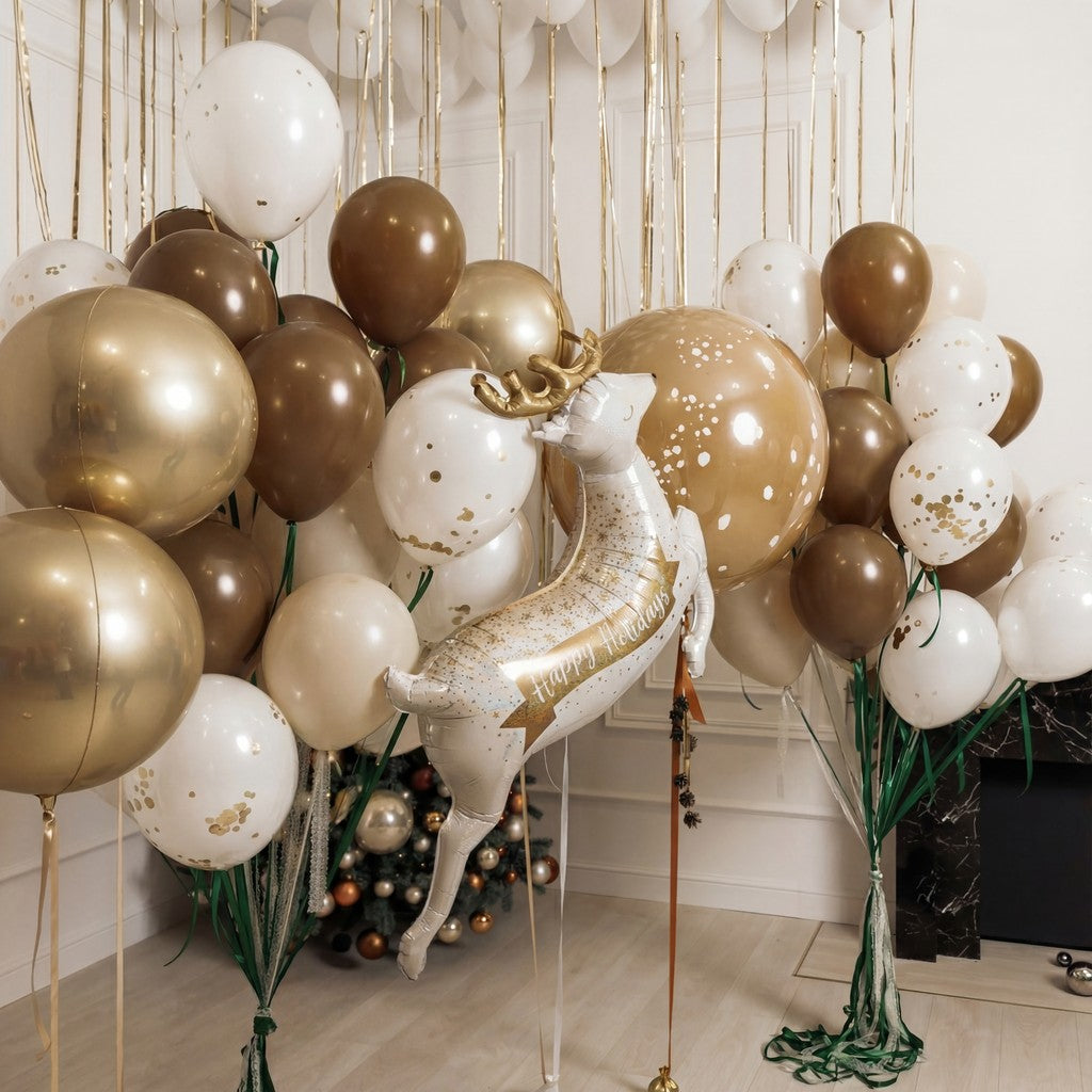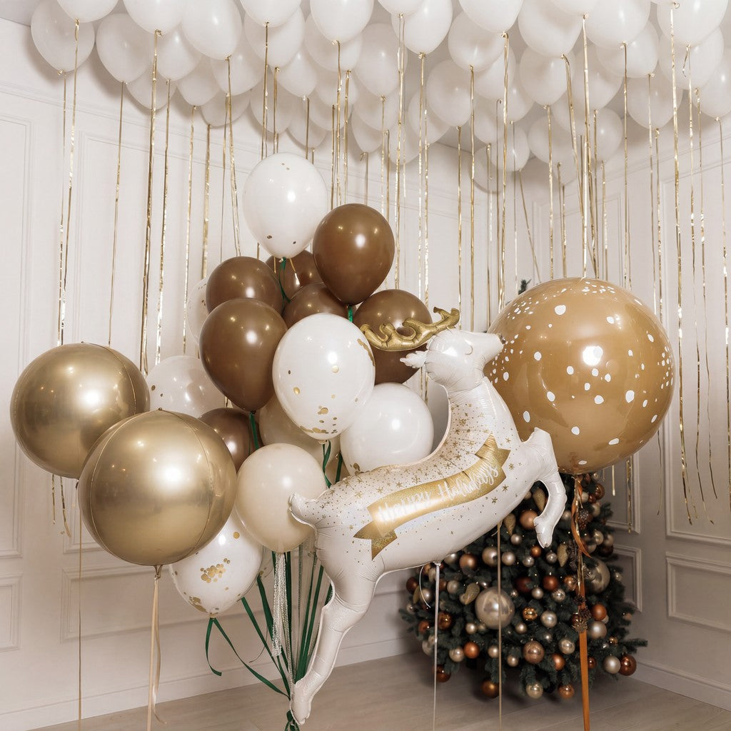 A warm and elegant holiday setup featuring gold-white balloons, shimmering confetti spheres, and a festive reindeer centerpiece. Soft, cozy, and beautifully illuminated - perfect for Christmas photos, home celebrations, and luxury winter events.