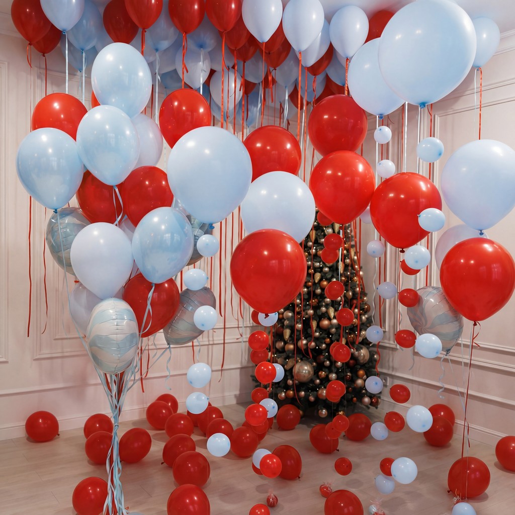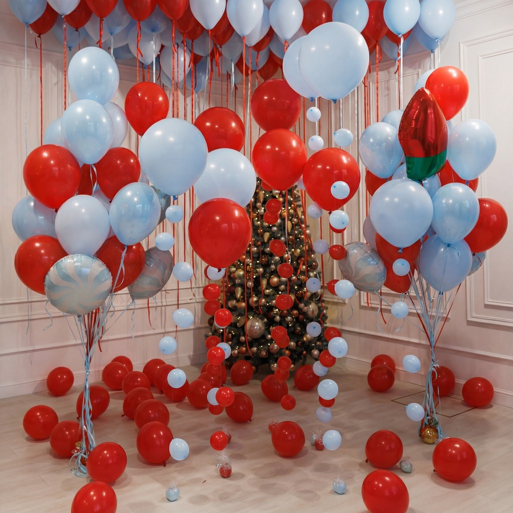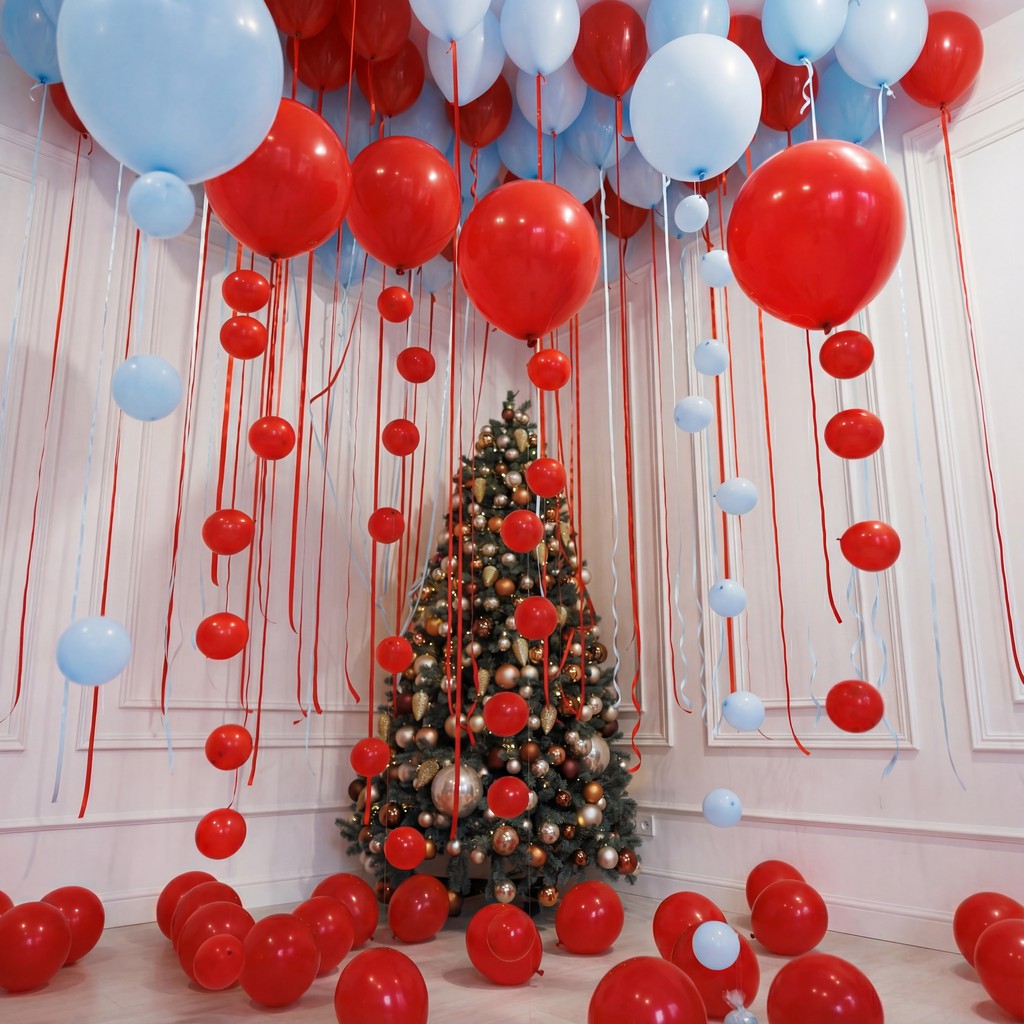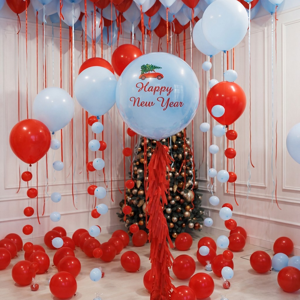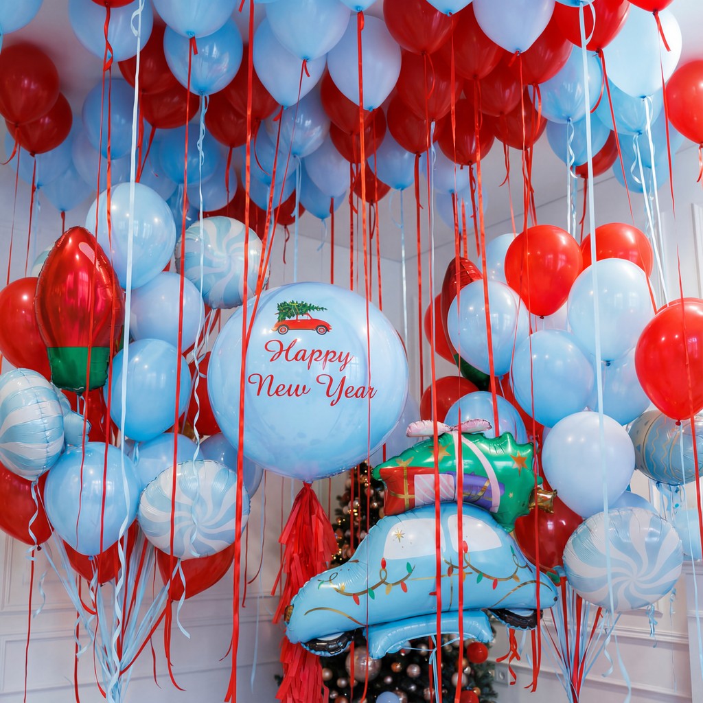A playful New Year setup with bright red and blue balloons, festive ribbons, and a cute holiday car loaded with gifts. Fun, cheerful, and full of celebration energy -the perfect backdrop for kids’ parties, family photos, and joyful winter moments.