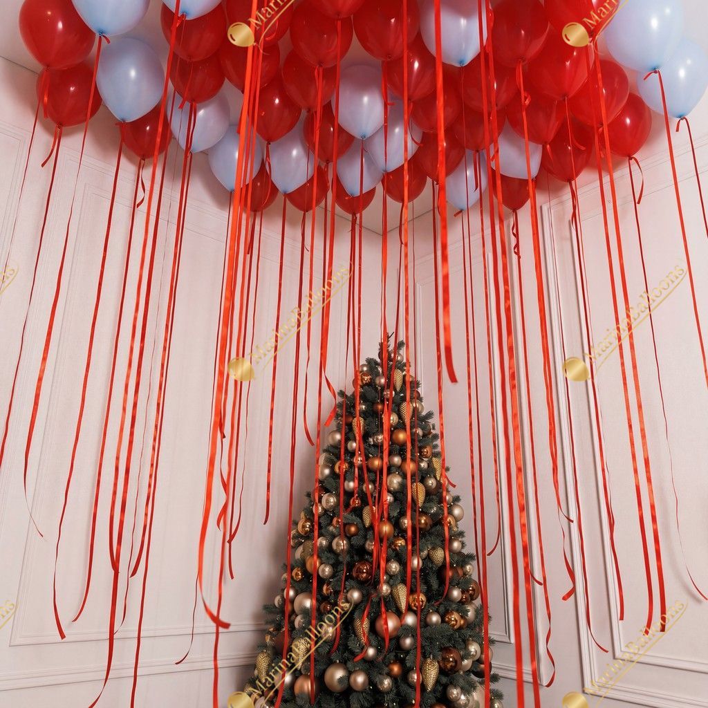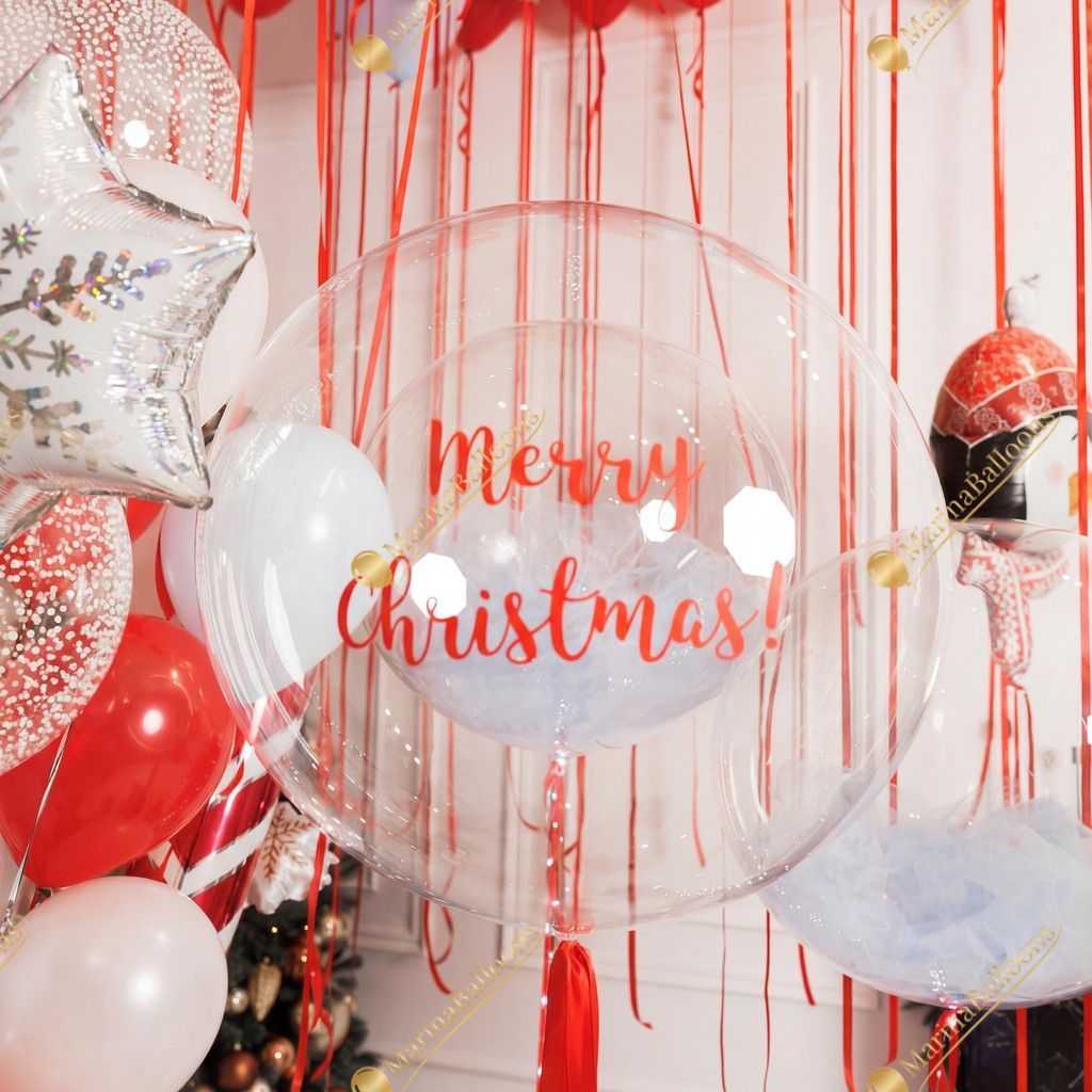 A cheerful Christmas setup filled with playful penguins, festive candy-cane balloons, shimmering clear spheres, and a ceiling of bright red ribbons. Fun, warm, and full of holiday spirit - the perfect scene for kids’ parties, family photos, and joyful winter celebrations.